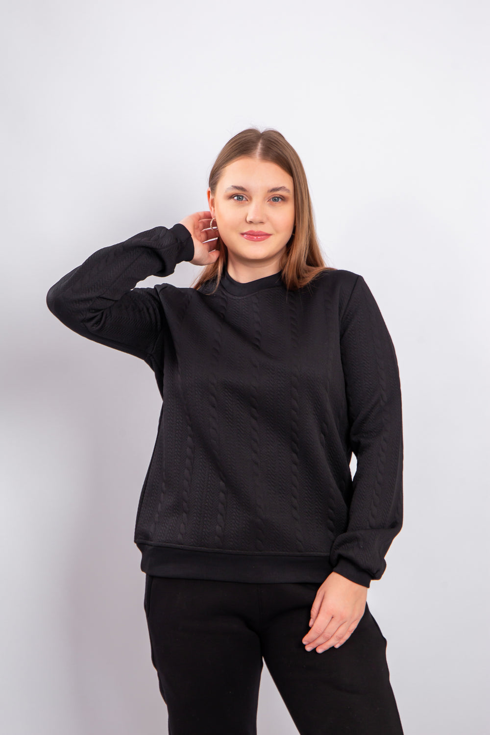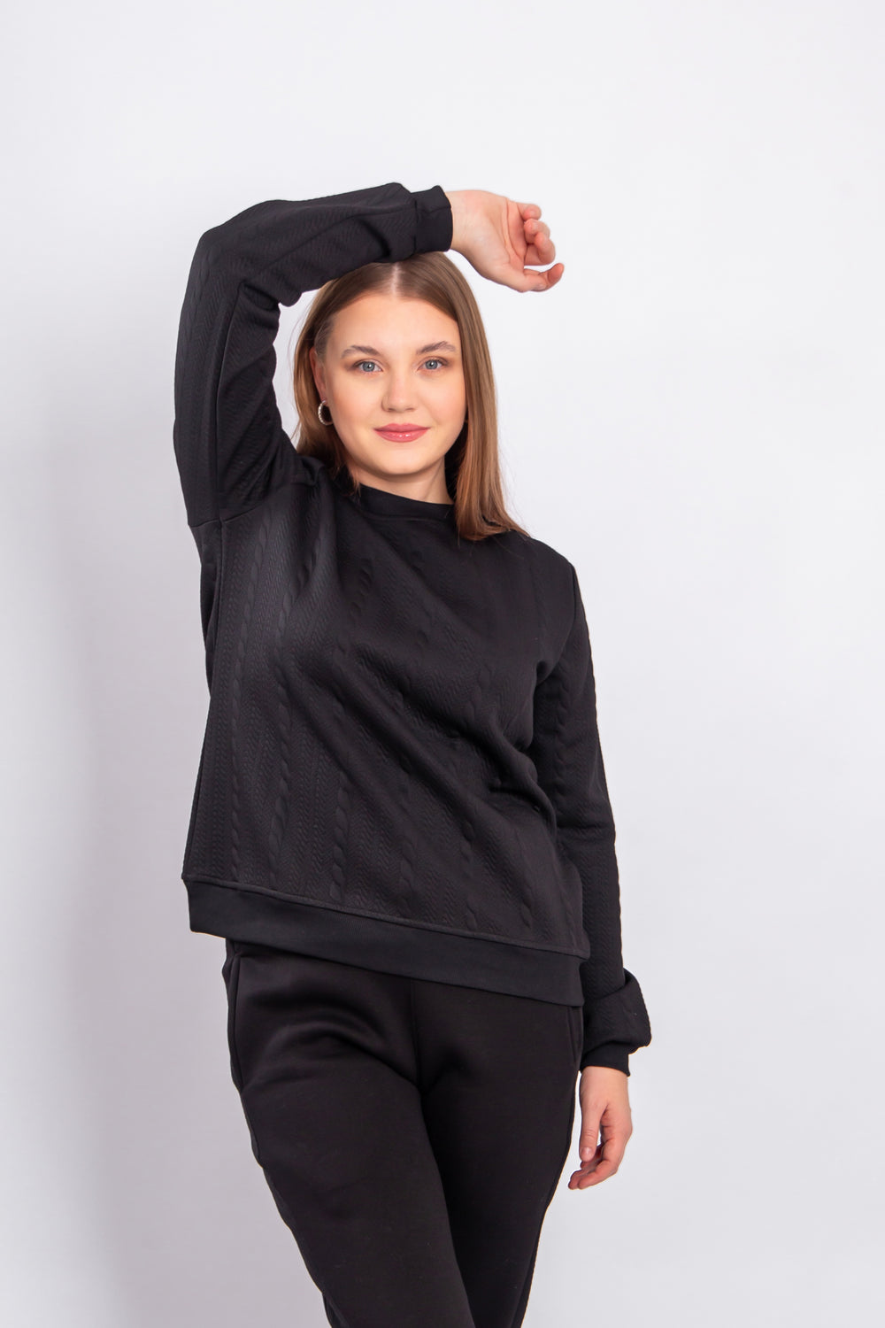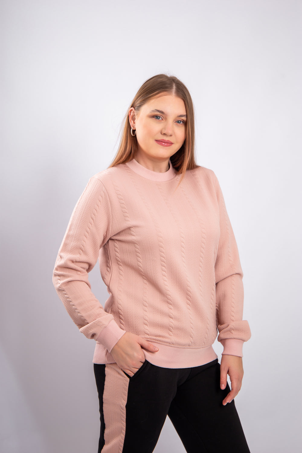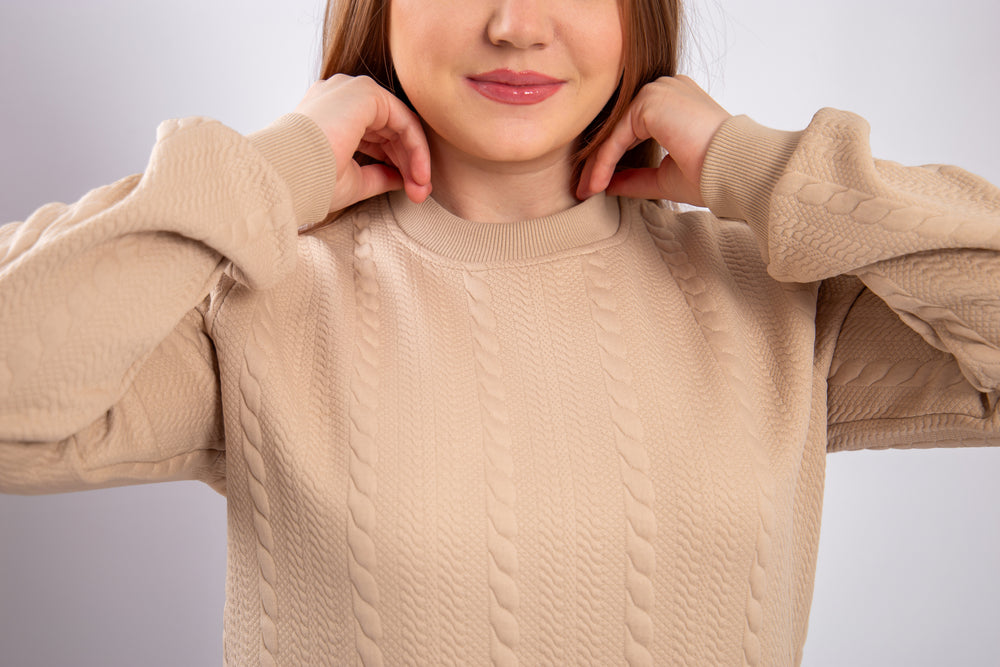 This model is crafted from soft jacquard fabric with a textured pattern that adds an elegant and distinctive look. The material is durable, comfortable to wear, and retains its shape over time. It provides a warm and cozy feel, making it suitable for mild to cool weather. The design is modern and practical, perfect for everyday wear or stylish casual outfits.