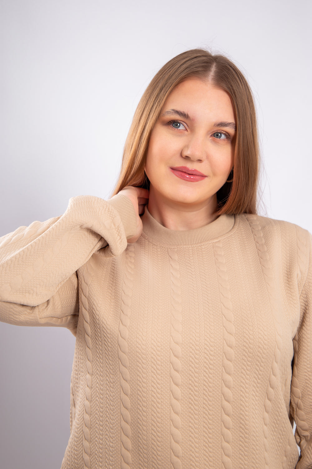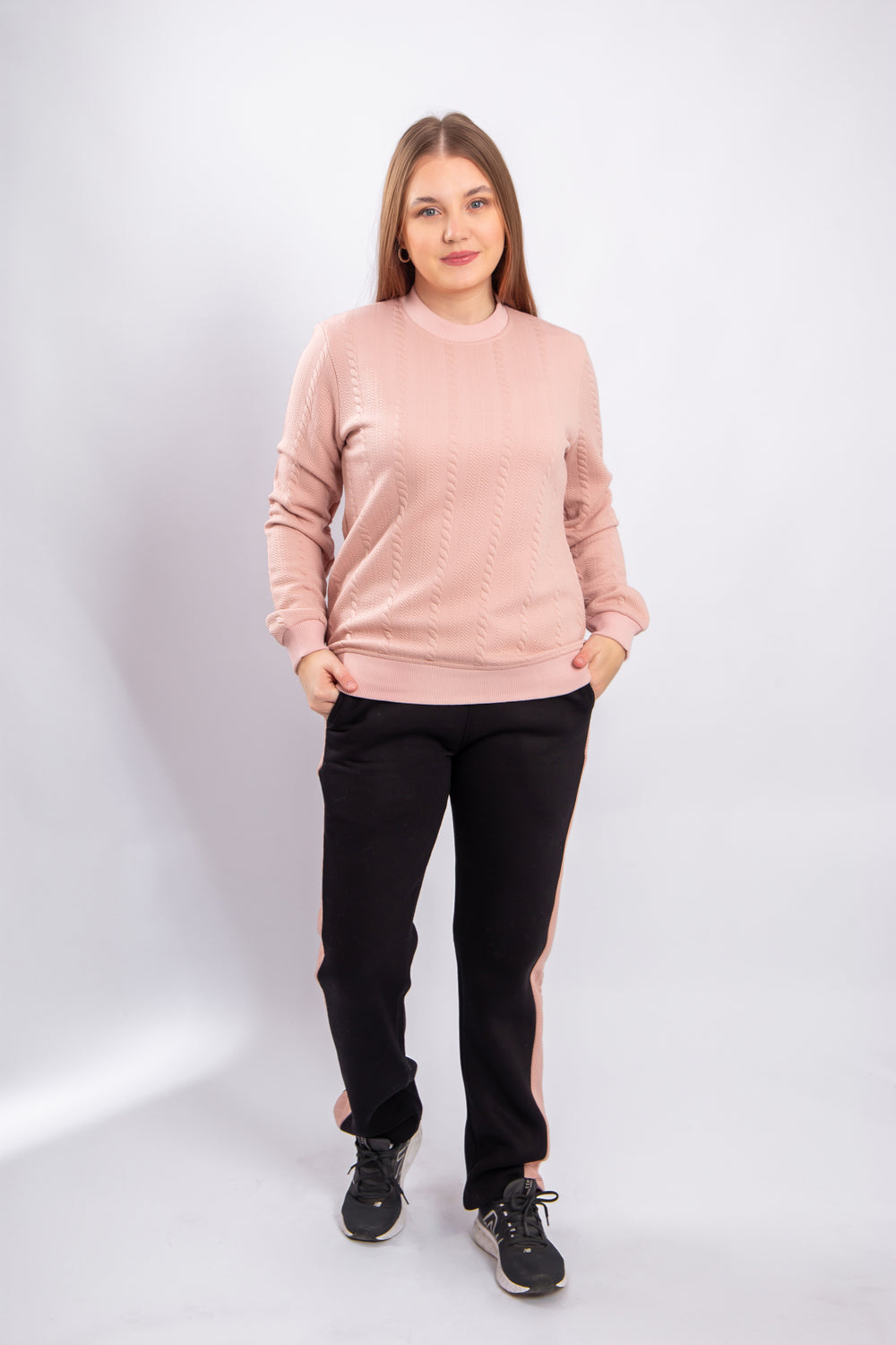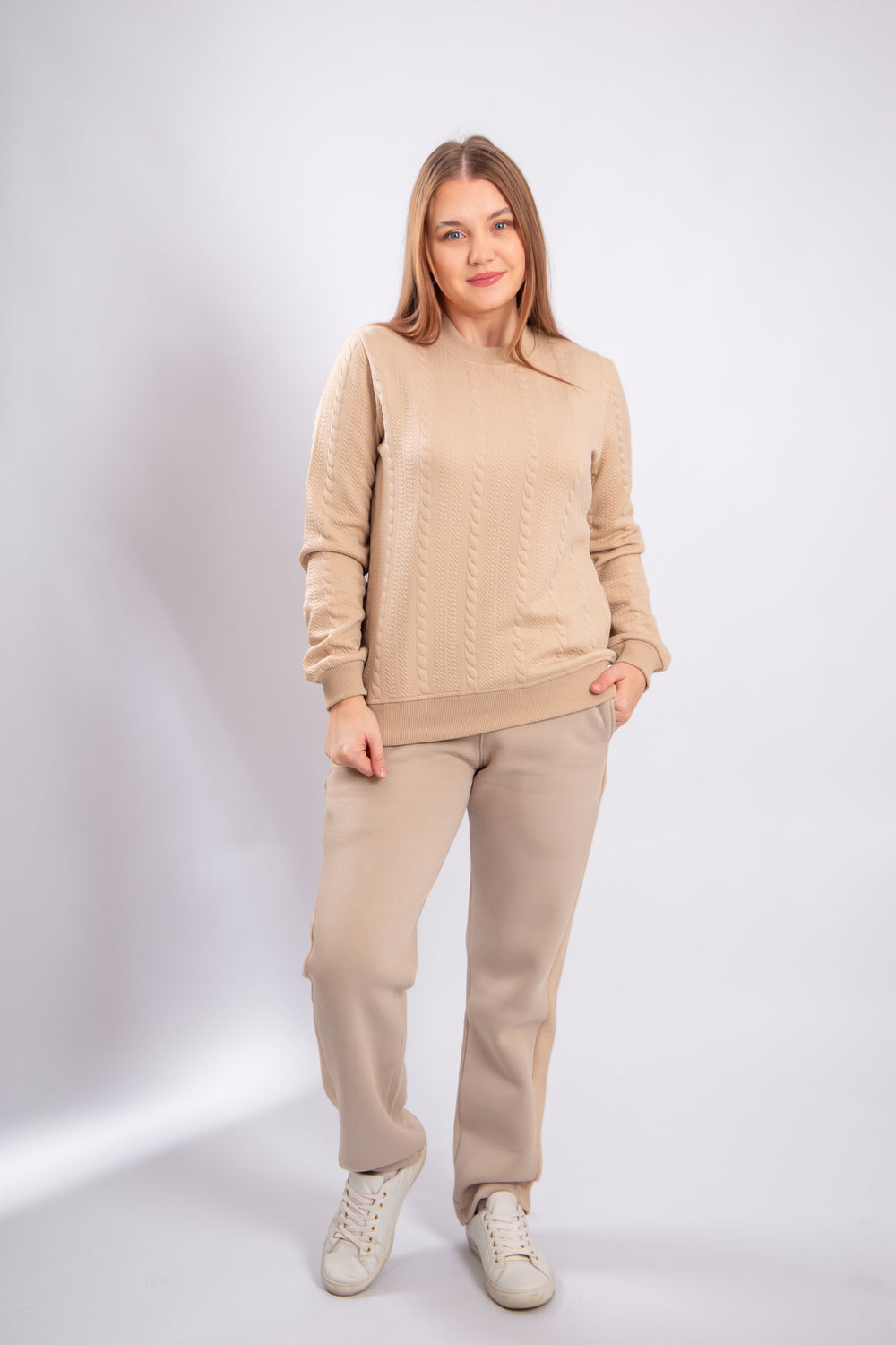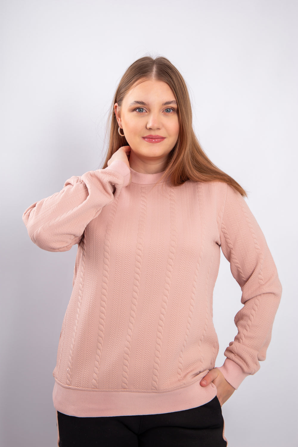 This model is crafted from soft jacquard fabric with a textured pattern that adds an elegant and distinctive look. The material is durable, comfortable to wear, and retains its shape over time. It provides a warm and cozy feel, making it suitable for mild to cool weather. The design is modern and practical, perfect for everyday wear or stylish casual outfits.