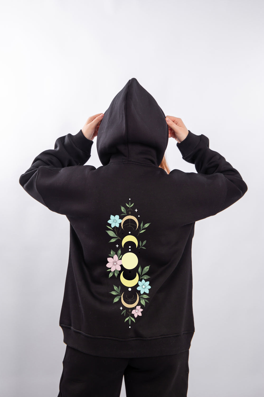 hoodie featuring a striking back print that blends moon phases with delicate floral elements in soft, calming colors. Inspired by nature and the quiet beauty of the night, this design adds a unique, feminine touch to any casual look. The vertical artwork on the back creates an eye-catching statement from the first glance. Made from comfortable, practical fabric to keep you warm and cozy all day long.